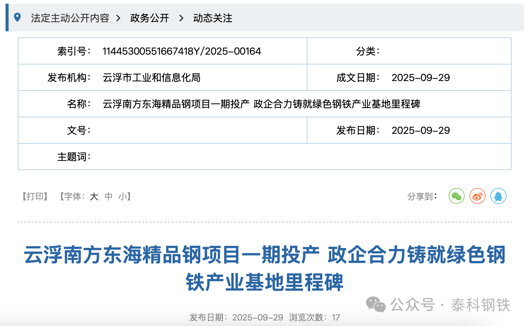 據(jù)云浮市工業(yè)和信息化局2025年9月29日消息,2025年9月,南方東海精品鋼項目一期的核心生產(chǎn)線,歷經(jīng)高效建設與精心調(diào)試,于近期正式投產(chǎn)。這標志著云浮市在打造千億級金屬智造產(chǎn)業(yè)集群、構(gòu)建現(xiàn)代化產(chǎn)業(yè)體系的征程上邁出了堅實而關鍵的一步。